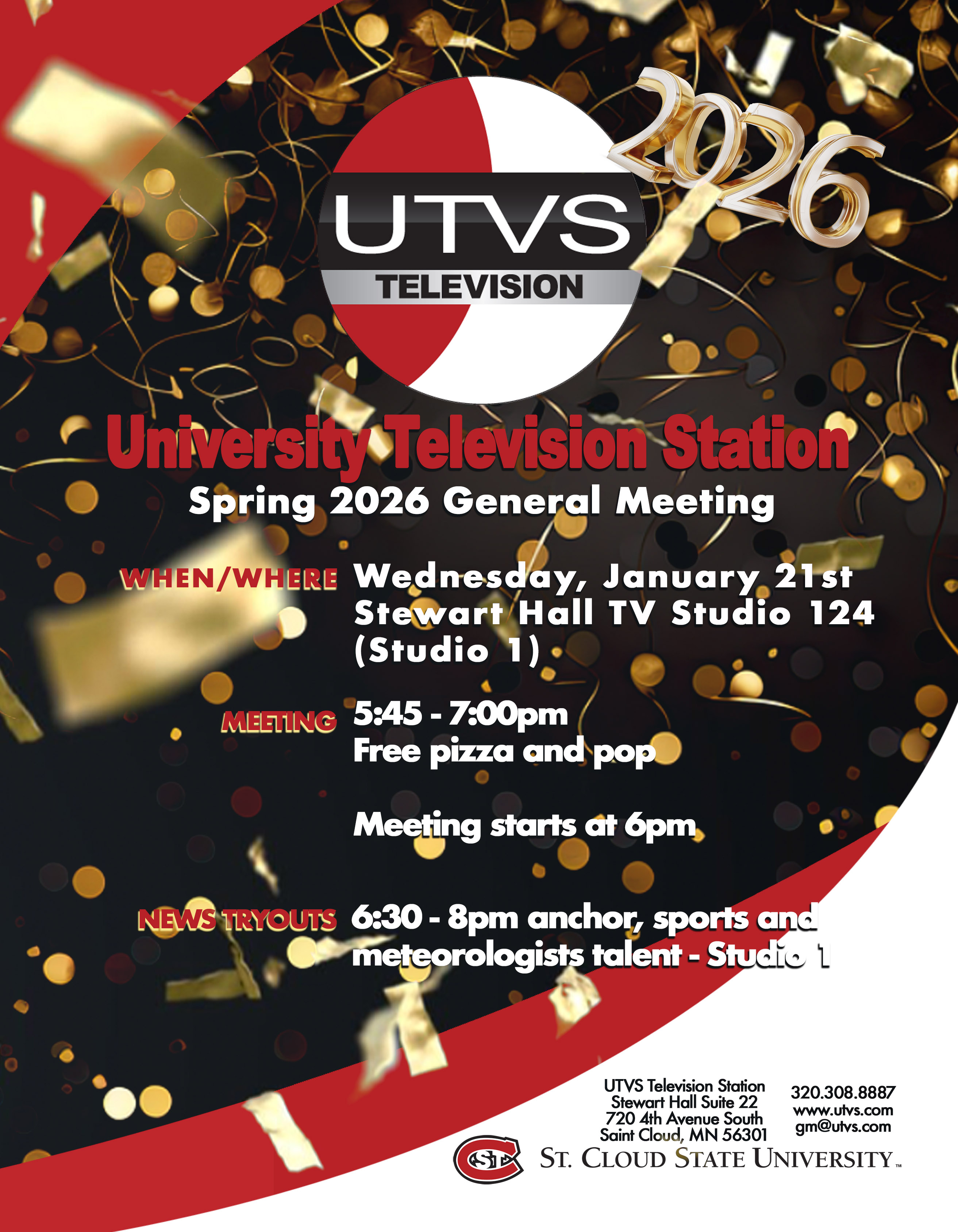 Attend the UTVS Television Spring 2026 General Meeting on Wednesday, January 21st 2026, at 5:45 pm CST in Stewart Hall 124 TV Studio - Studio 1.